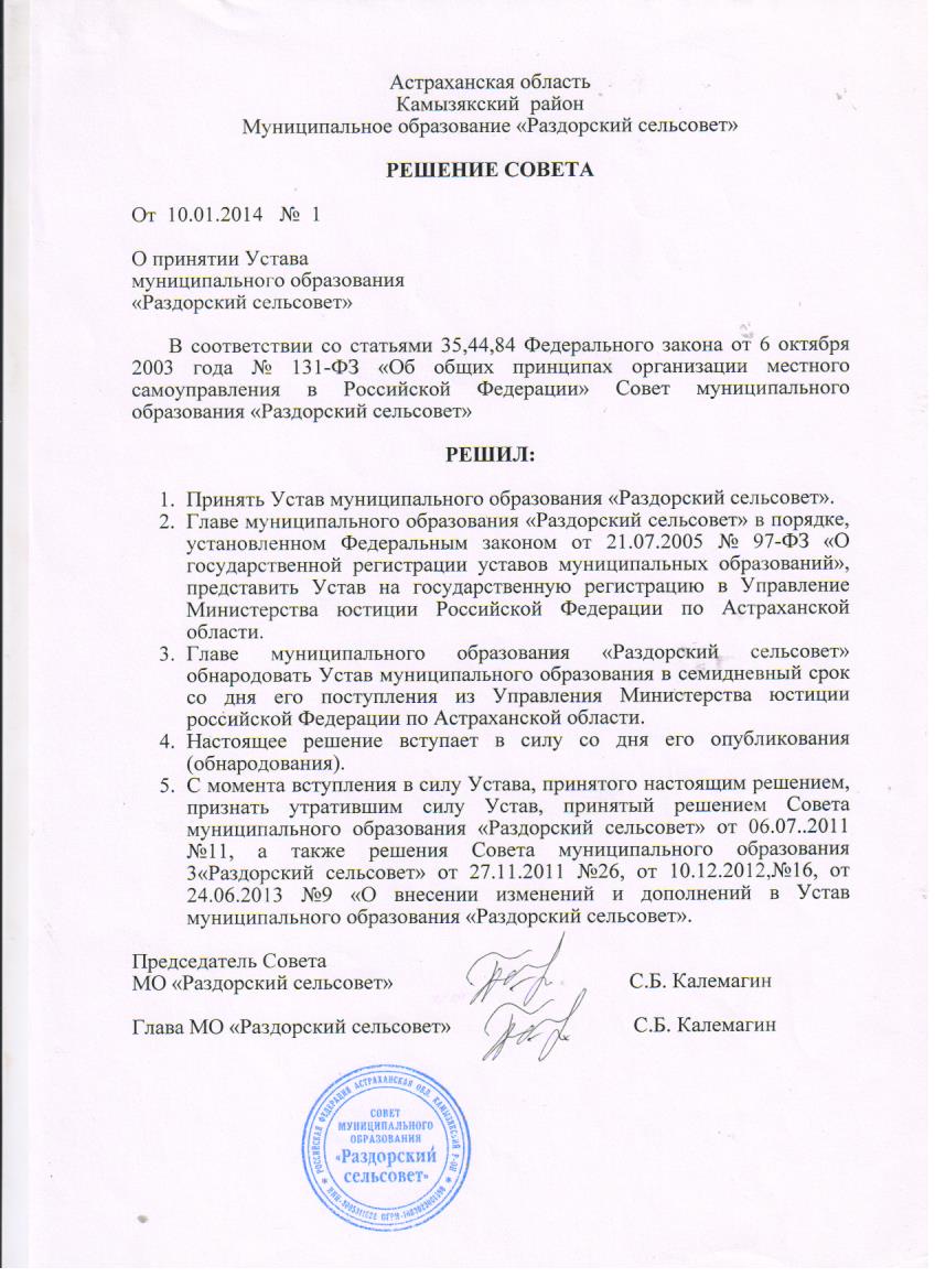 - РЕШЕНИЕ СОВЕТА № 1 Oт 10.01.2014 О принятии Устава муниципального образования «Раздорский сельсовет»