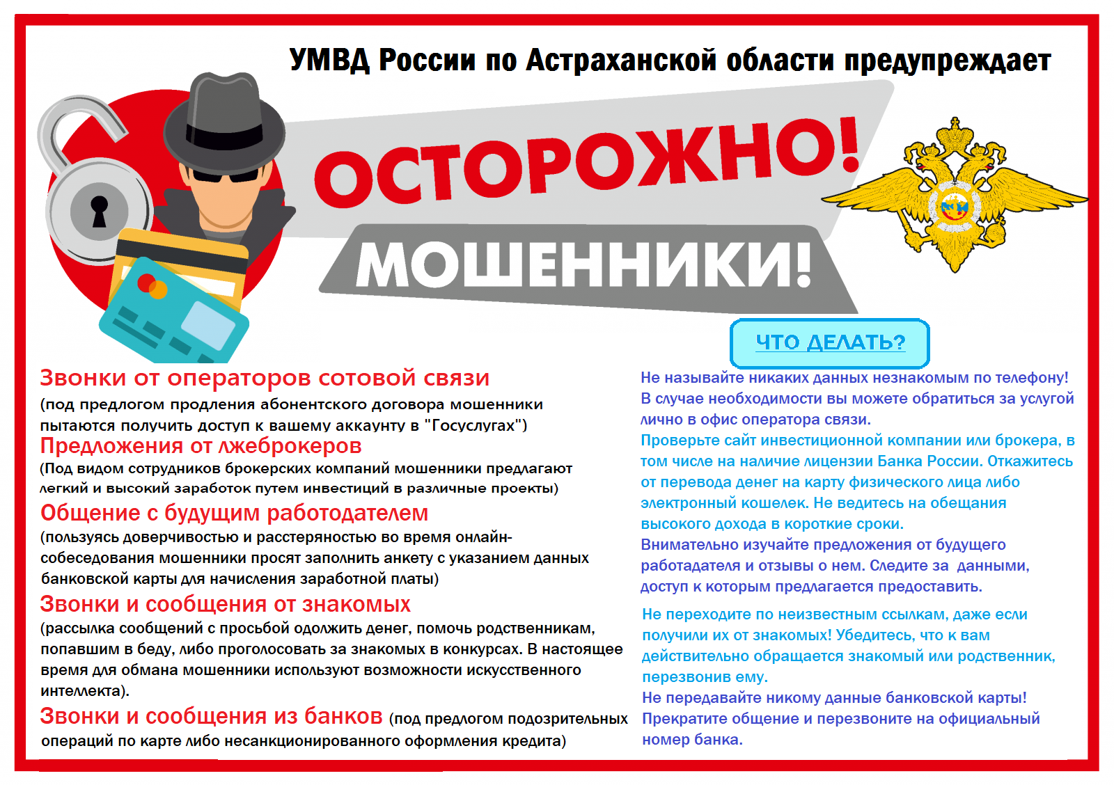В целях предупреждения и профилактики таких преступлений информируем граждан Камызякского района о способах и методах противодействия преступным схемам, о необходимости бдительности и крайней осторожности при использовании банковских счетов и карт, паролей от учетных записей и личных кабинетов в различных интернет-сервисах, а также любой информации, связанной с ними.