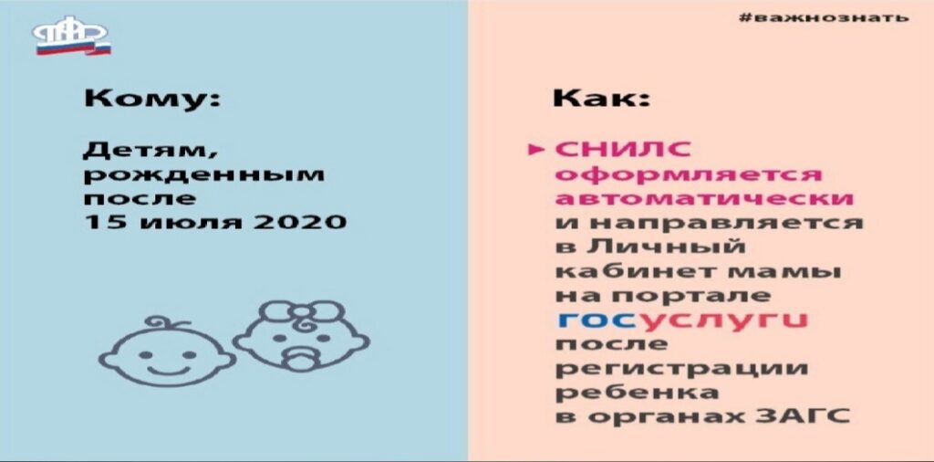 На детей, родившихся с 15 июля 2020 года, родителям больше не требуется оформлять СНИЛС. Пенсионный фонд самостоятельно пришлет номер в личный кабинет мамы. Соответствующий сервис реализован на портале Госуслуг. После появления в информационной системе ПФР сведений о рождении ребенка, поступивших из реестра ЗАГС, номер индивидуального лицевого счета ребенка будет оформлен автоматически и направлен в личный кабинет мамы на портале ЕПГУ. Данный сервис доступен тем родителям, которые зарегистрированы на ЕПГУ. Чтобы оперативно получить уведомление об оформленном СНИЛС по электронной почте или в смс, необходимо выбрать соответствующие настройки в личном кабинете. Для семей, которые усыновили детей, сохраняется прежний заявительный порядок оформления СНИЛС, поскольку необходимые сведения могут представить только сами усыновители. Подробнее о том, как зарегистрироваться на ЕПГУ — https://www.gosuslugi.ru/help/faq/c-1/1.