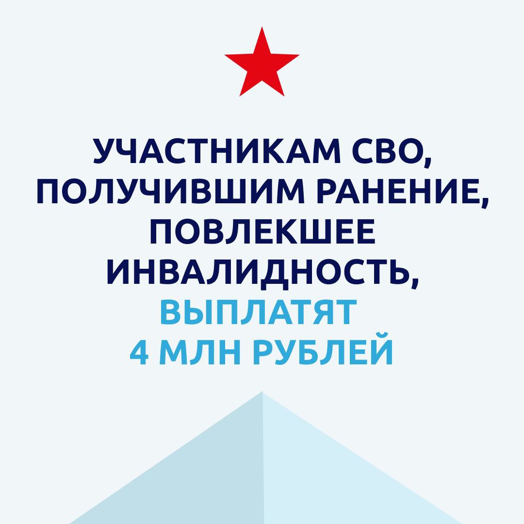 Президент России Владимир Путин увеличил размер выплат до 4 млн рублей участникам СВО при получении ранения, повлекшего инвалидность (с учетом единовременной выплаты, произведенной при получении этого увечья)